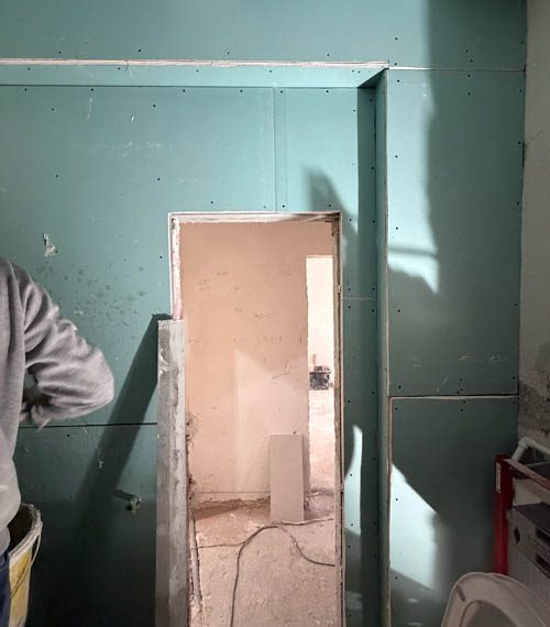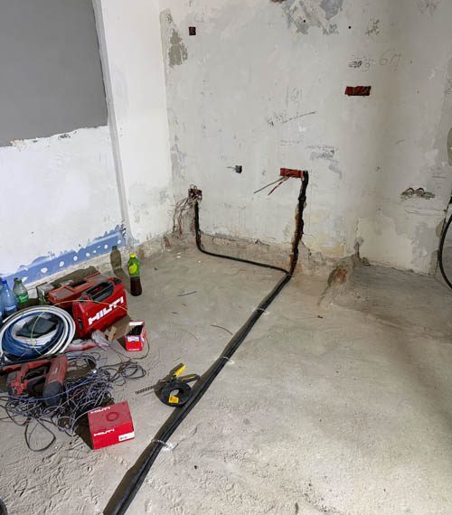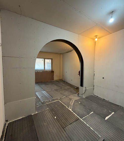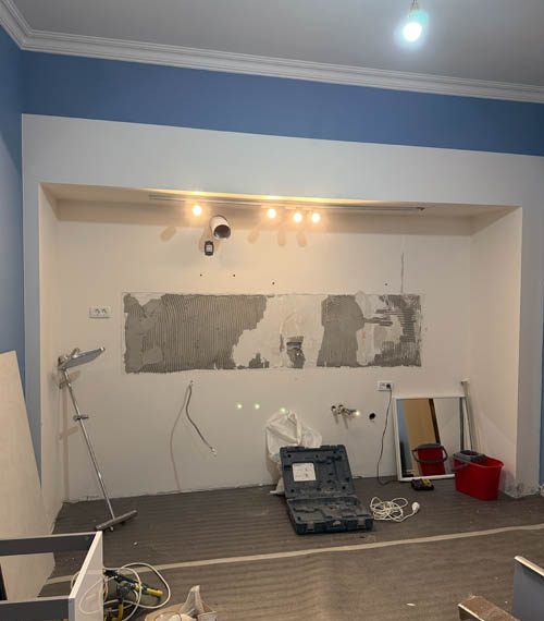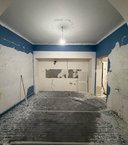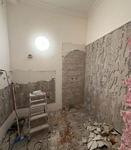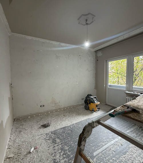 Lucrările au debutat cu decopertarea integrală a celor două băi și desfacerea parchetului existent. Șapa veche a fost demolată în totalitate. Pereții au fost îndreptați cu tencuială armată cu adeziv și plasă, asigurând o bază solidă și uniformă pentru toate finisajele ulterioare.